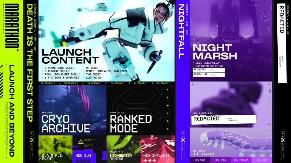 La feuille de route s’articule autour de saisons trimestrielles, chacune apportant son lot de nouveautés : armes, implants, contrats, ajustements d’équilibrage, événements et améliorations.
