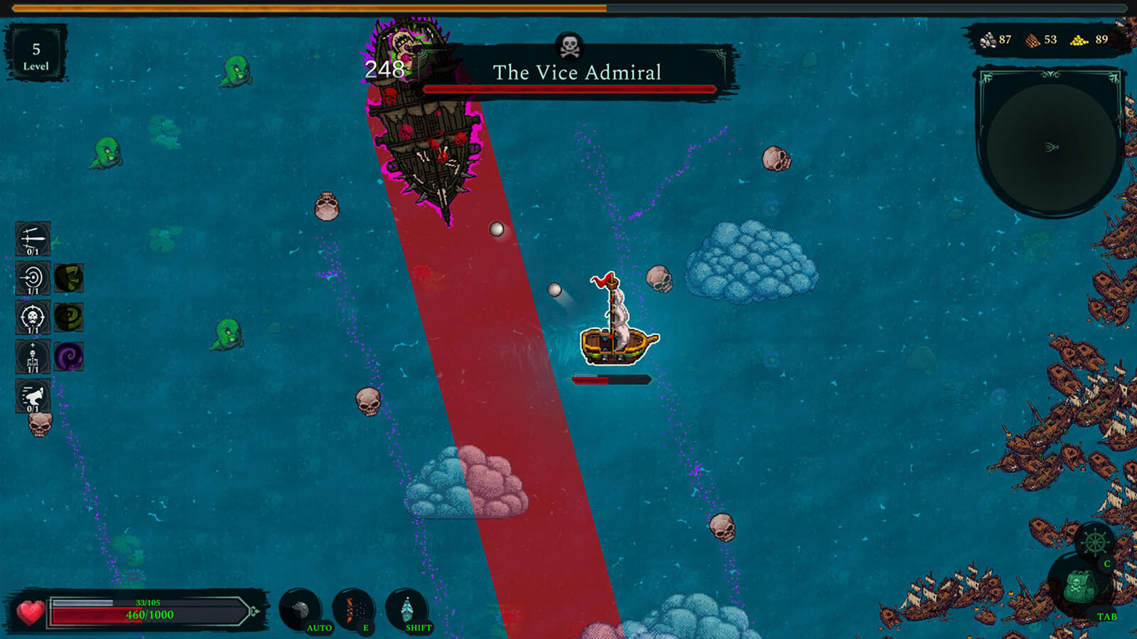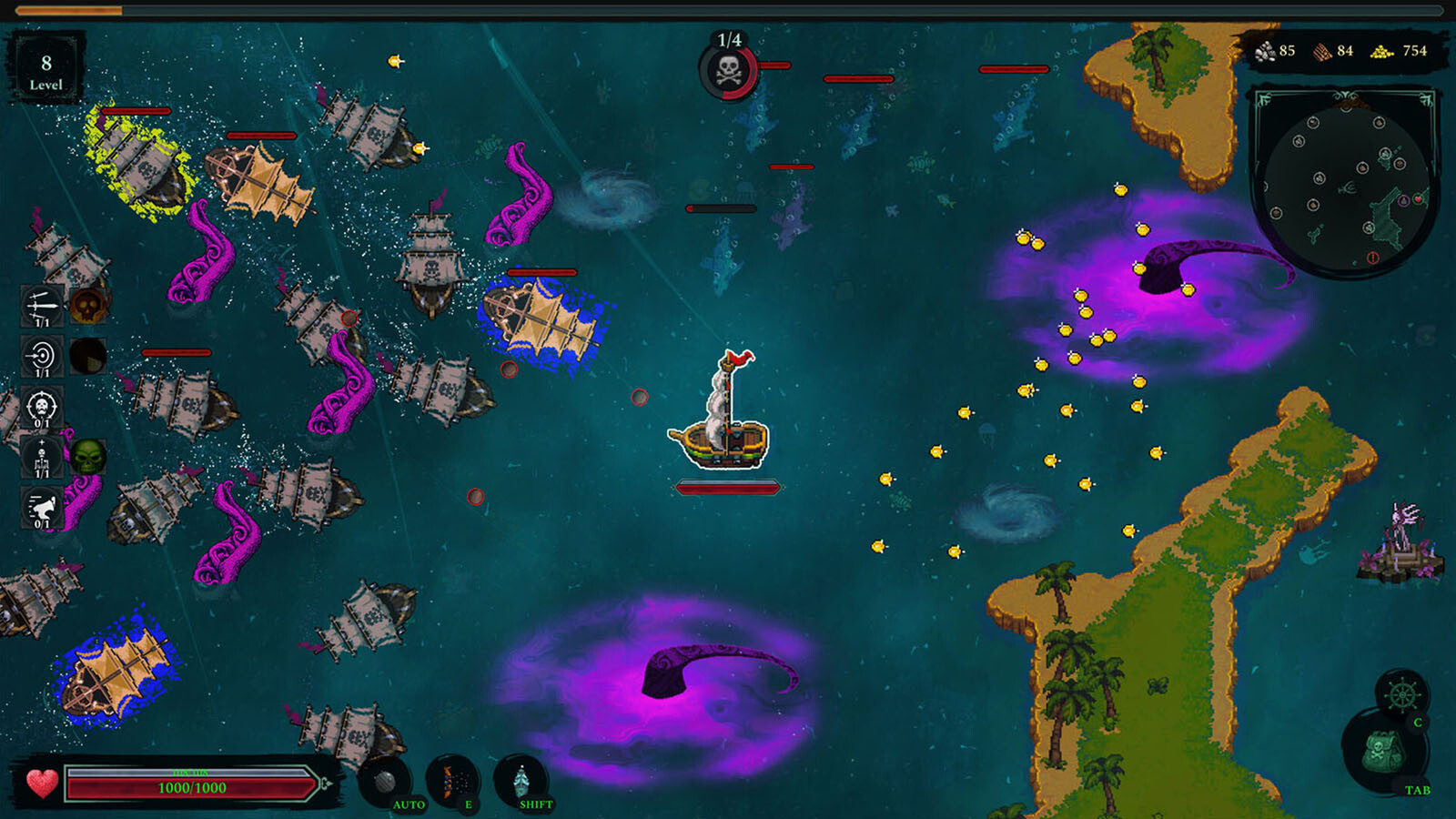 - Des vagues d’ennemis infinies ! Les ennemis ne cesseront d’vous attaquer, plus puissants et plus malins à chaque fois ! Utilisez votre intelligence pour naviguer entre les îles et les monstres marins !