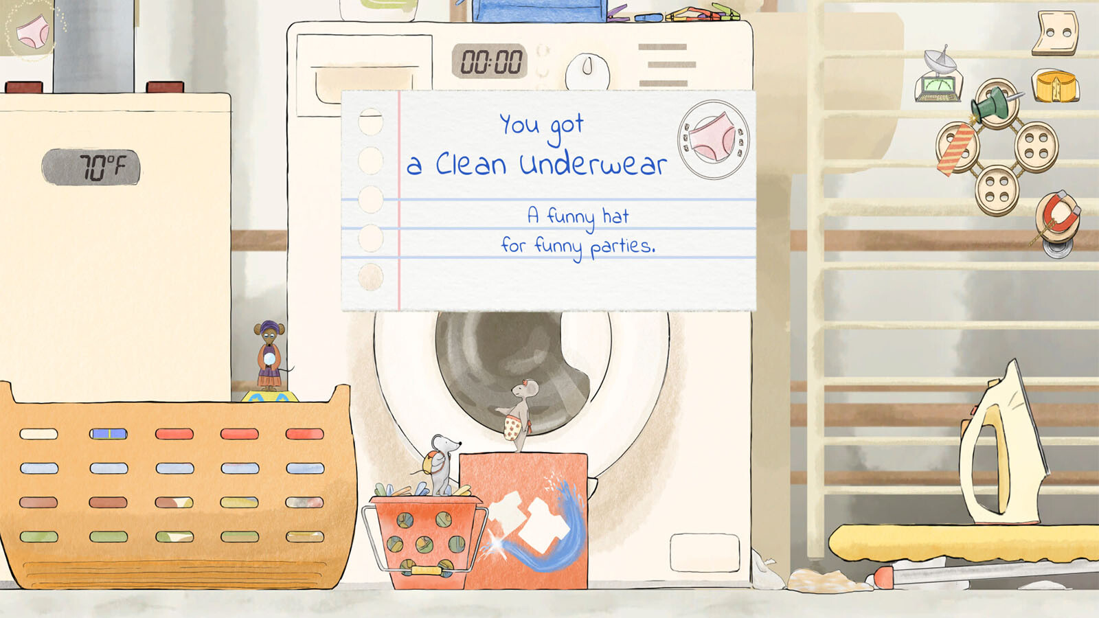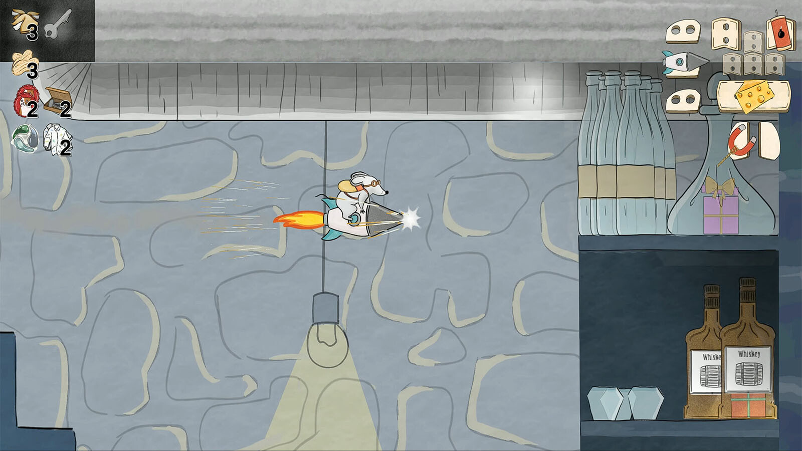 Chaque run est une expérience compacte de Metroid-like. Vous trouverez des objets permettant d'explorer la maison différemment à chaque fois. Du grappin magnétique vous permettant d’accéder au robinet de la salle de bains, à la fusée pouvant casser la vitre du buffet, la maison est pleine d'objets, chacun ayant son utilité.